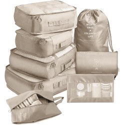 8-Piece Garment Bags Set, Packing Cubes, Compression Packing Bags for Backpack and Suitcase, Luggage Organiser, Suitcase Organiser, Travel Garment Bags for Clothes, Shoes, Underwear, Cosmetics, Khaki