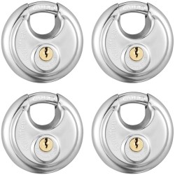 Pack of 4 Stainless Steel Key Disc Padlocks with Key 6.5cm Wide, 3/8 Diameter Disc Shackle for Storage Units, Sheds, Garages and Fences
