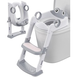 Детска тоалетна седалка със стъпала, тоалетна седалка за момчета и момичета, регулируема по височина и сгъваема, тоалетна седалка с подложка, предпазна преграда и противоплъзгаща се стъпка (бяла/сива)
